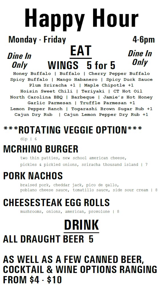 We feature a variety of other snacks - $6 veggie options, $7 McRhinos, $8 Pork Nachos, $8 Cheesesteak Egg Rolls
